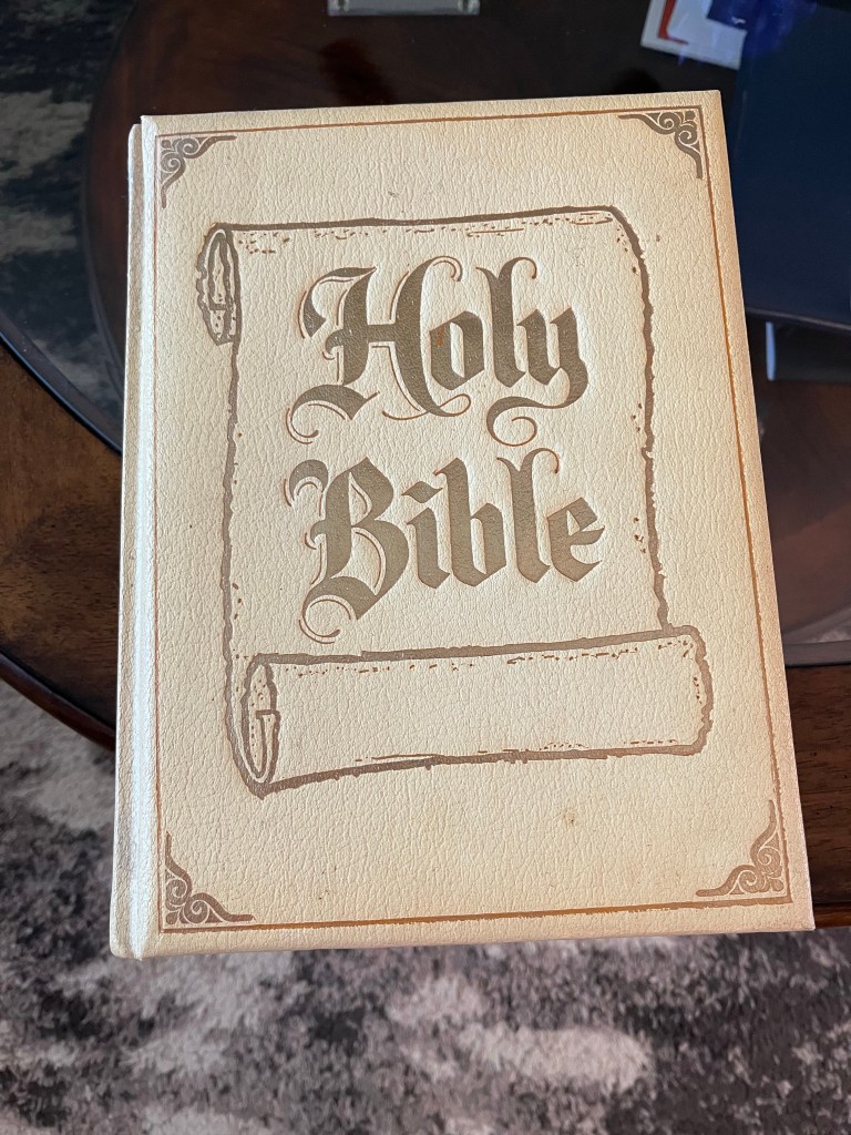 I’ve been reminded of days gone by, windows raised, houses opened, and coffee table bibles in every home. We had one too, this is it in the photo below.